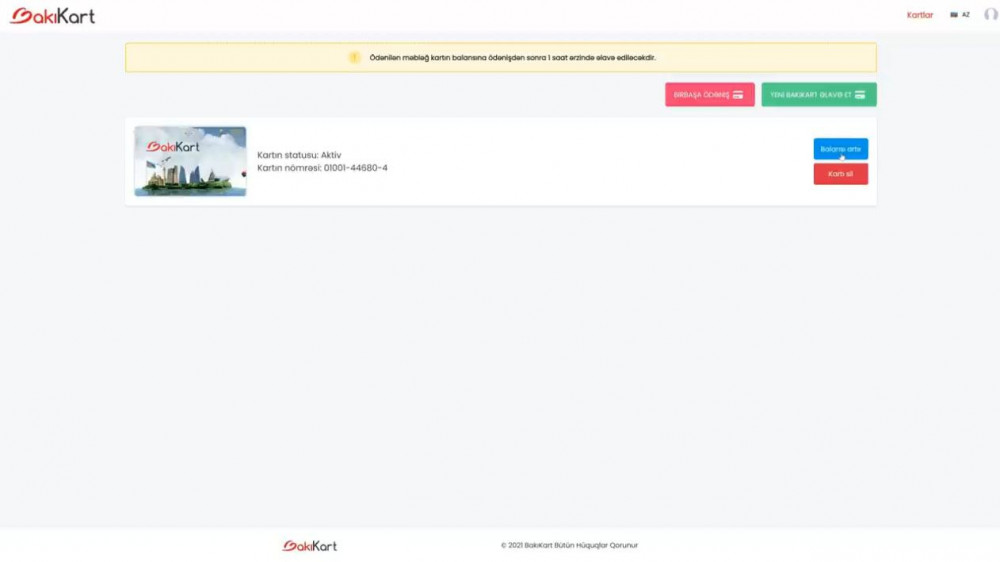 Bunun üçün əvvəlcə online.bakikart.az saytına keçid edirik. Yeni istifadəçilərin elektron poçt və ya telefon nömrəsi ilə qeydiyyatdan keçərək şəxsi kabinet yaratması vacibdir. Əvvəlcə poçt ünvanını daxil edirik. Sonra yeni şifrəni təyin edib təsdiq üçün onu növbəti xanada təkrar yazırıq. "Mən robot deyiləm" bölməsini işarə edib "qeydiyyatdan keç" düyməsini sıxırıq. Bir neçə saniyə ərzində burda qeyd etdiyiniz elektron poçt ünvanına qeydiyyatı tamamlamağınız üçün link göndəriləcək. Həmin linkə keçid edərək qeydiyyatı tamamlıyırıq. Artıq platformadan istifadə edə bilərik. "E-mail" ünvanını daxil edib şifrəni də yazdıqdan sora "mən robot deyiləm" xanasını işarələyib "daxil ol" düyməsini sıxırıq. Açılan pəncərədə bizə ödənilən məbləğin 1 saat ərzində kartın balansına oturması ilə bağlı məlumat verilir. Bunu yadda saxlamaqda fayda var. Kart balansı 2 üsulla artırıla bilər. Birbaşa və ya kartın şəxsi kabinetə əlavə edilməsi ilə. Daha operativ ödəniş üçün kartı kabinetə əlavə etmək tövsiyə olunur. Bunun üçün müvafiq bölməyə keçid edirik, istifadə etdiyimiz “Bakı kart"ın arxa tərəfində olan 11 rəqəmli nömrəni bu xanaya yazıb "əlavə et" düyməsini sıxırıq. Beləliklə ödəniş kartı kabinetə əlavə edildi. Burada "balansı artır"ı klikləyib açılan pəncərədən məbləği seçərək "irəli" düyməsini sıxırıq. Göstərilən məlumatı təsdiq etdikdən sora bank kartının məlumatlarını uyğun xanalara doldurmaqla ödənişi tamamlaya bilərik.