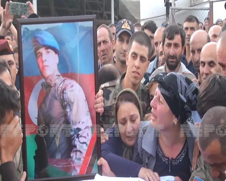 Mərasim iştirakçıları şəhidimizi “Qarabağ bizimdir, bizim olacaq”, “Şəhidlər ölməz, Vətən bölünməz” şuarları səsləndirərək son mənzilə yola salıblar.