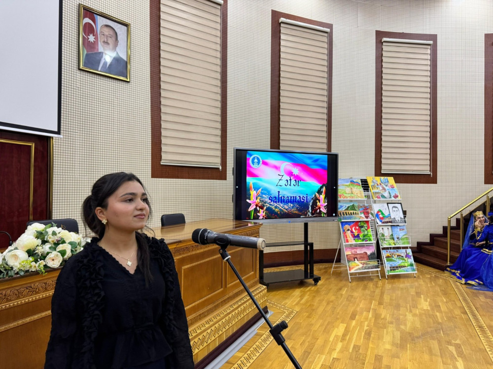 Fakültənin dosenti Elgül Hüseynova çıxışında şəhidlərin müqəddəs xatirəsinin hər zaman qəlblərdə yaşayacağını vurğulayıb, Vətənə həsr olunmuş şeir ifa edib.