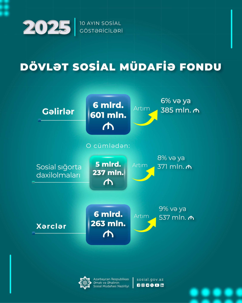 Yanvar-oktyabr aylarında DSMF-nin xərcləri 6 mlrd. 263 mln. manat təşkil edib ki, bu da ötən ilin müvafiq dövrünə nisbətən 9 faiz və ya 537 mln. manat çoxdur.
