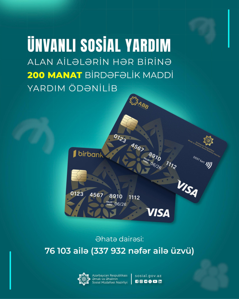 - dekabrın 25-də isə dekabr ayının müavinət, təqaüd və ünvanlı sosial yardımlarını ödəyib.