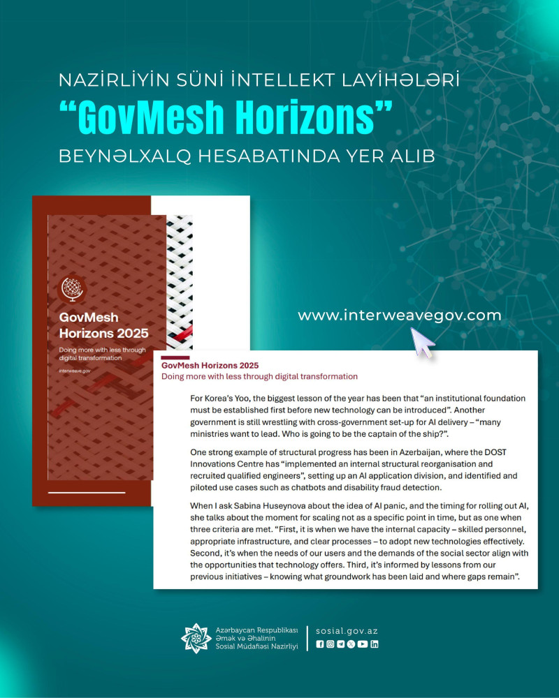 Qaziler.az bildirir ki, hesabatda Əmək və Əhalinin Sosial Müdafiəsi Nazirliyinin tabeliyində DOST Rəqəmsal İnnovasiyalar Mərkəzinin sosial sahədə rəqəmsallaşma istiqamətində təcrübəsi, o cümlədən tətbiq etdiyi süni intellekt layihələri barədə də məlumat verilir. https://www.interweavegov.com/_files/ugd/c0cbec_9d848330b15a427ea0dee5e2016af3ee.pdf