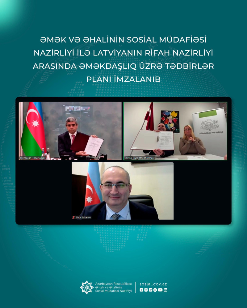 Sonra Anar Əliyev və Reinis Uzulnieks Azərbaycan Respublikasının Əmək və Əhalinin Sosial Müdafiəsi Nazirliyi ilə Latviya Respublikasının Rifah Nazirliyi arasında əmək, məşğulluq və əhalinin sosial müdafiəsi sahələrində əməkdaşlıq haqqında Memorandumun icrası ilə bağlı 2026-2027-ci illər üçün Tədbirlər Planını imzalayıblar.