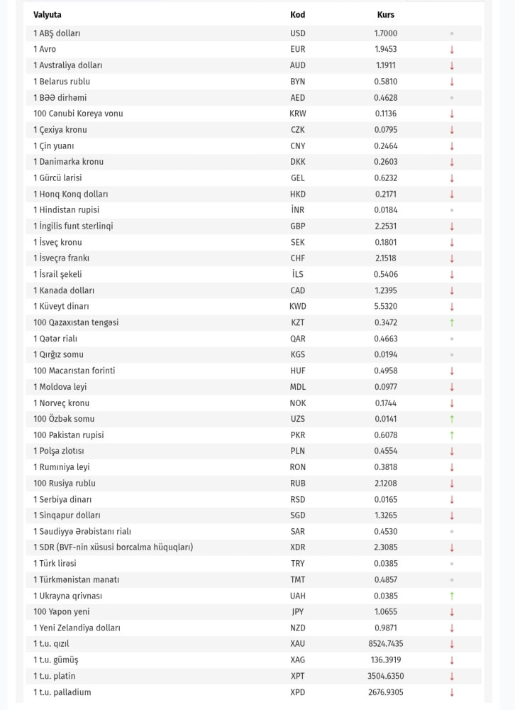 Azərbaycan Mərkəzi Bankı bu günün valyuta məzənnələrini açıqlayıb.
