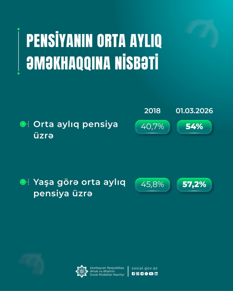 2018-ci ildən ötən dövrdə icra olunan 5 sosial islahat paketinin bir istiqaməti olaraq pensiyalarda davamlı artımlara nail olunması orta aylıq pensiyanın orta aylıq əməkhaqqına nisbətinin (əvəzetmə əmsalı) qabaqcıl beynəlxalq normalara uyğunlaşdırılmasında mühüm irəliləyişə imkan verib.