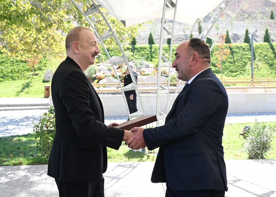 Digər kişi sakin: Kənddə evləri hərə bir tərəfdə tikmişdi - dağda, daşda. İndi şəhər tiplidir, gözəldir, möhtəşəmdir. Təşəkkür edirəm, cənab Prezident.