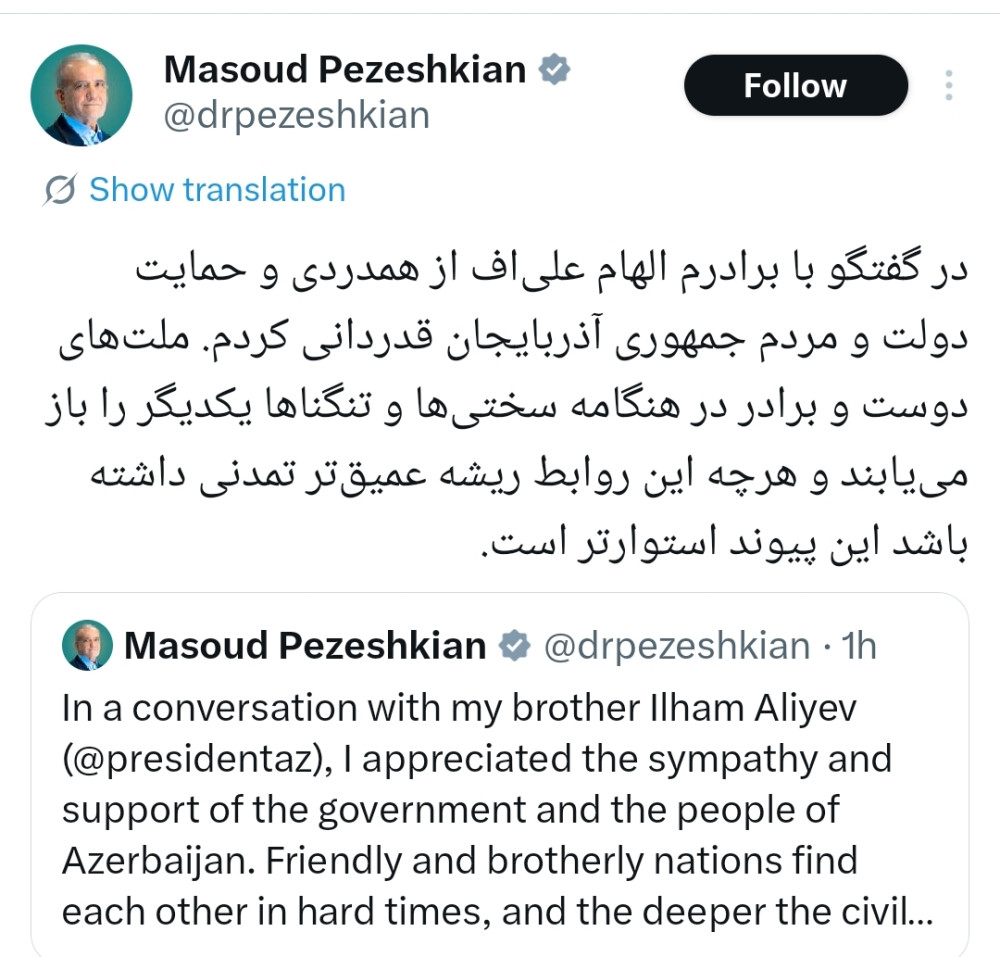 "Qardaşım İlham Əliyevlə söhbətimdə Azərbaycan hökumətinin və xalqının həmrəylik və dəstəyinə görə minnətdarlığımı bildirdim. Dost və qardaş xalqlar çətin anlarda bir-birini tanıyır və sivilizasiya kökləri nə qədər dərindirsə, bu bağ bir o qədər möhkəm olur" , - deyə o paylaşımında yazıb.