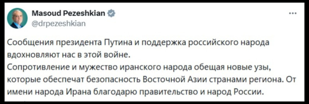 Modern.az xəbər verir ki, Pezeşkian ABŞ və İsraillə münaqişədə göstərdikləri dəstəyə görə, rusiyalı həmkarı Vladimir Putinə və Rusiya xalqına təşəkkür edib.